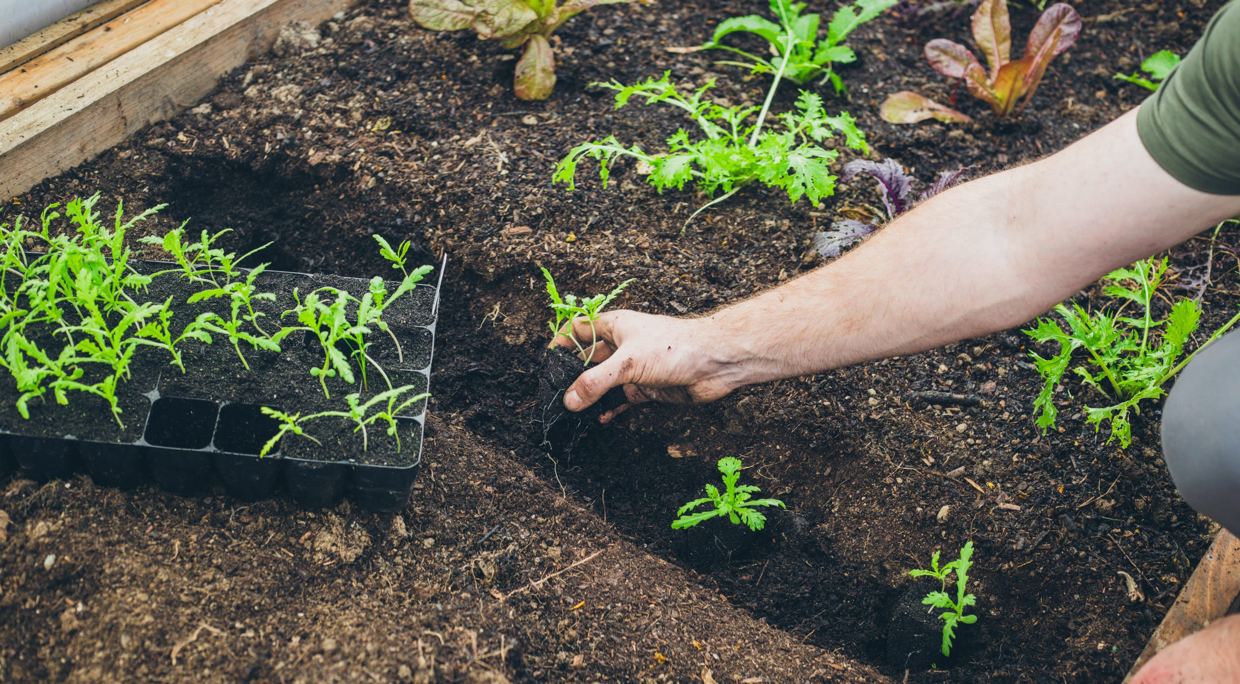 Image: transplanting chop suey green seedling in early October 2024 in a polytunnel bed
