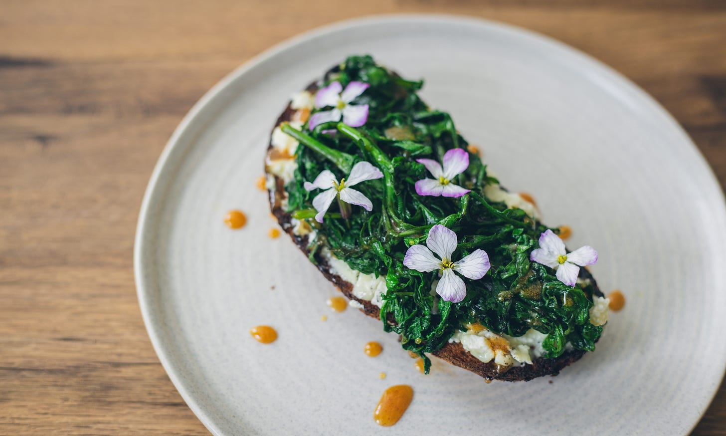 Then spread the goat's cheese over the garlicy toast, place the wilted greens over, drizzle some hot honey, and finally finish with some edible flowers. This is exactly how homegrown food should be enjoyed; simple with a little ‘sizzle’.